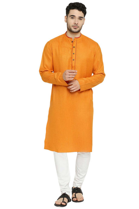 Men's Orange Poly Cotton Mandarin Collar Long Kurta