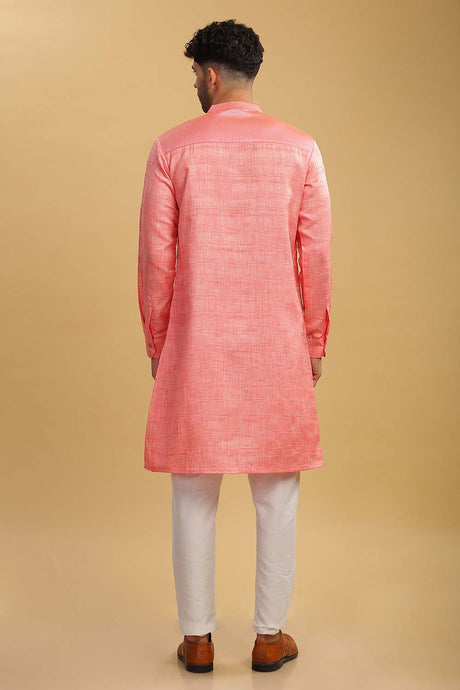 Men's Pink Poly Cotton Mandarin Collar Long Kurta