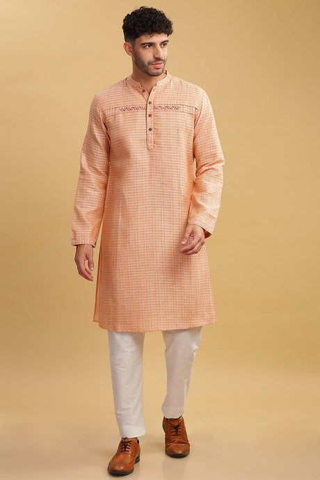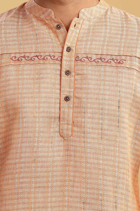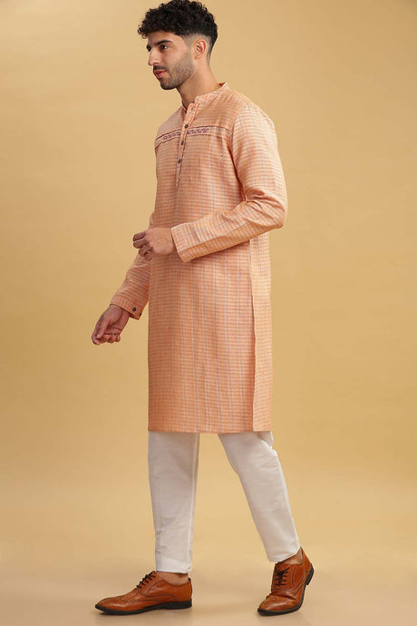 Men's Peach Poly Cotton Mandarin Collar Long Kurta