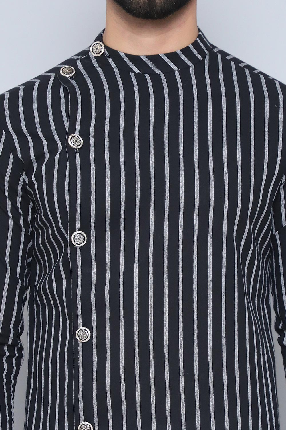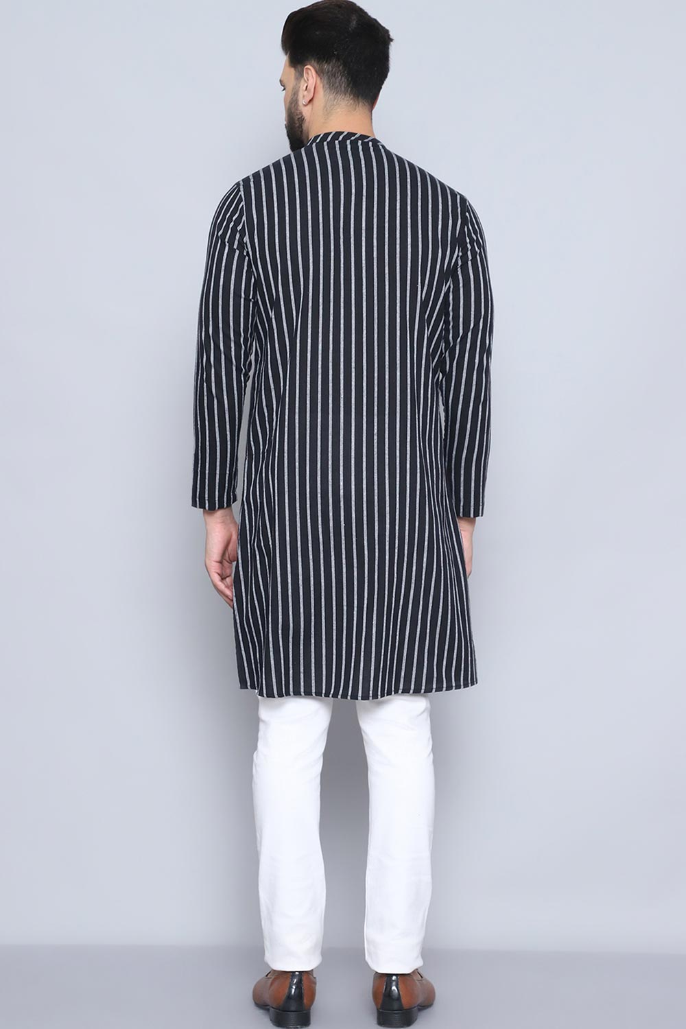 Elevate your wardrobe with this chic black cotton striped long kurta. Perfect for a range of occasions, from casual outings to more polished events, this kurta combines timeless style with modern details.