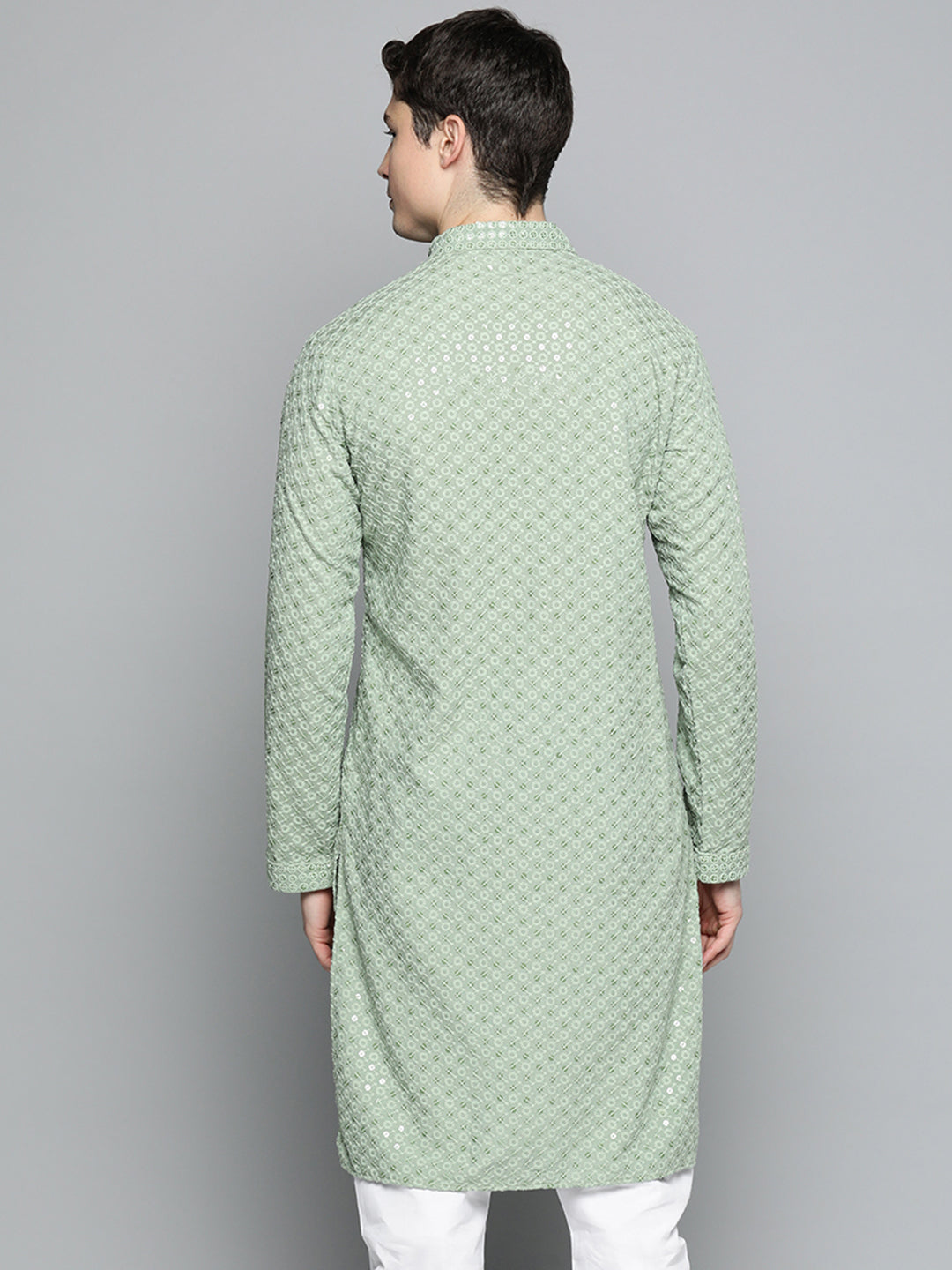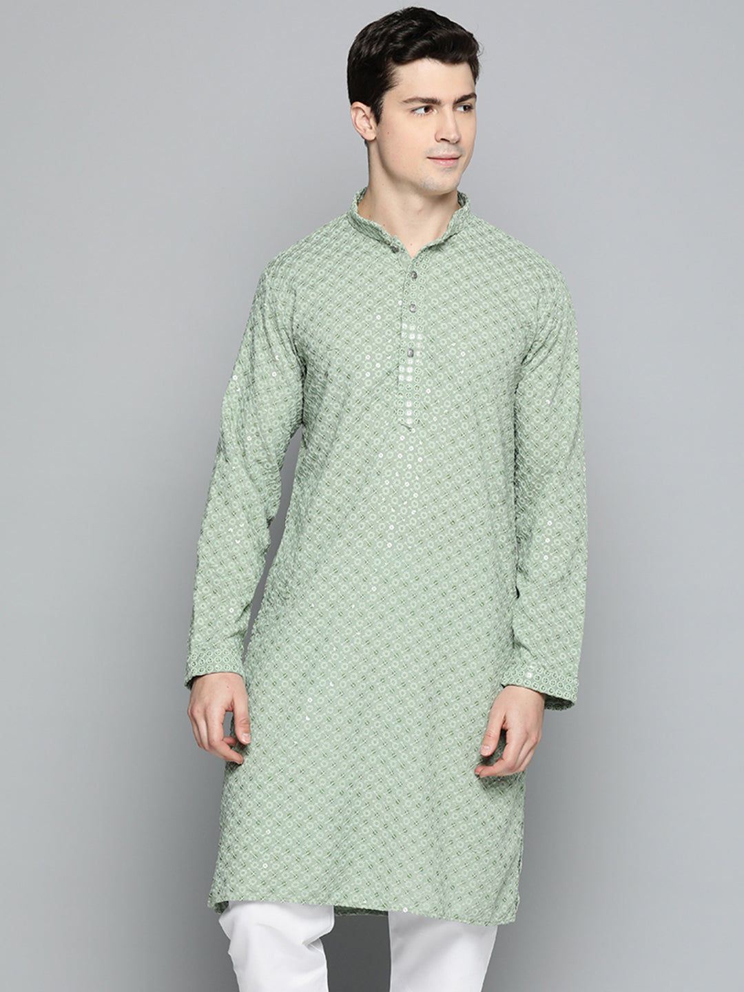 Men's Pista Green Chikankari Embroidered And Sequin Kurta