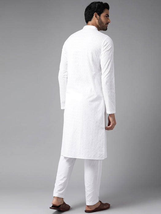 Men's White Cotton Chikankari Embroidered Straight Kurta Top