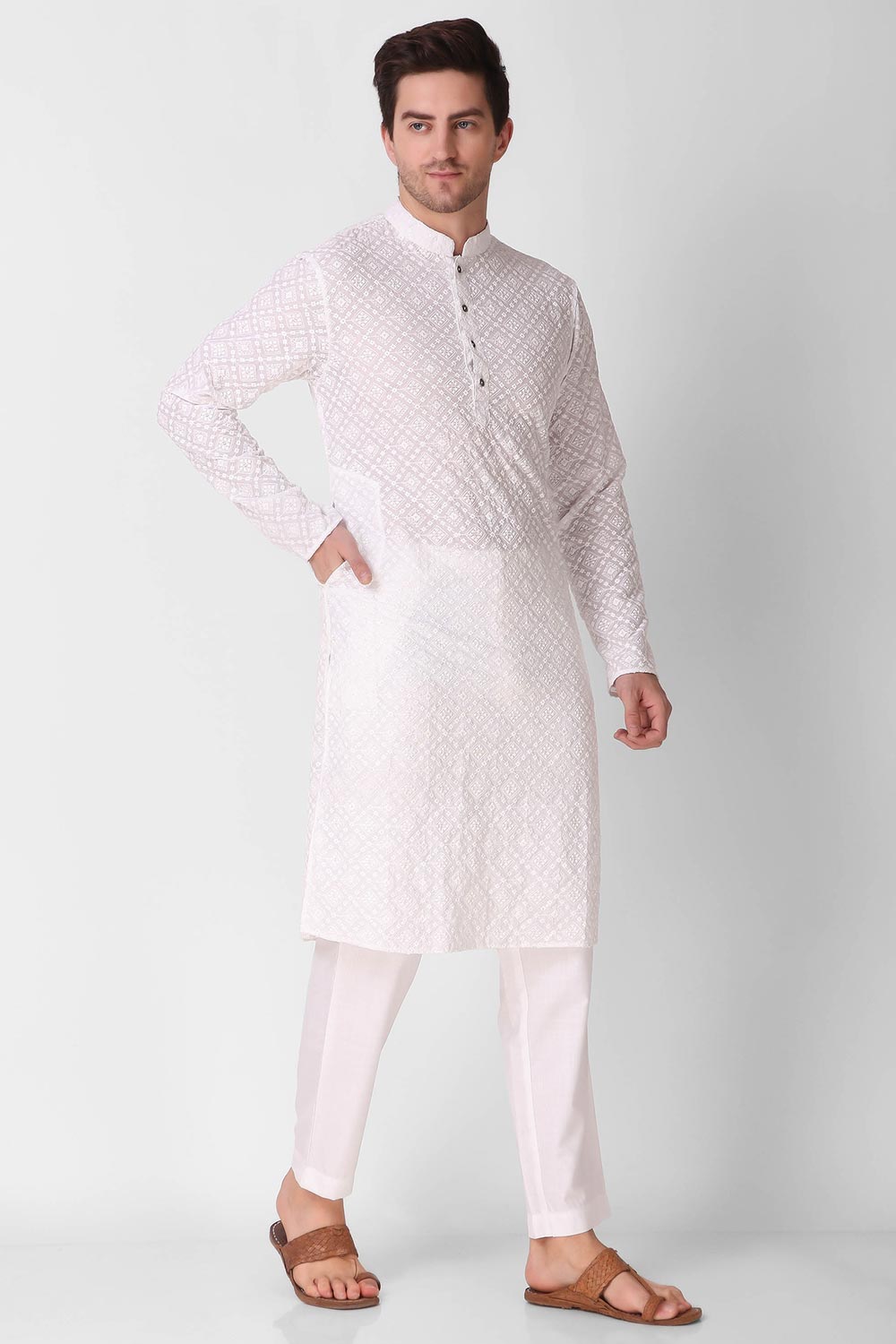 This white cotton embroidered long kurta combines classic elegance with intricate detailing. The pristine white fabric serves as a canvas for beautiful embroidery, making it a perfect choice for both casual and festive occasions.