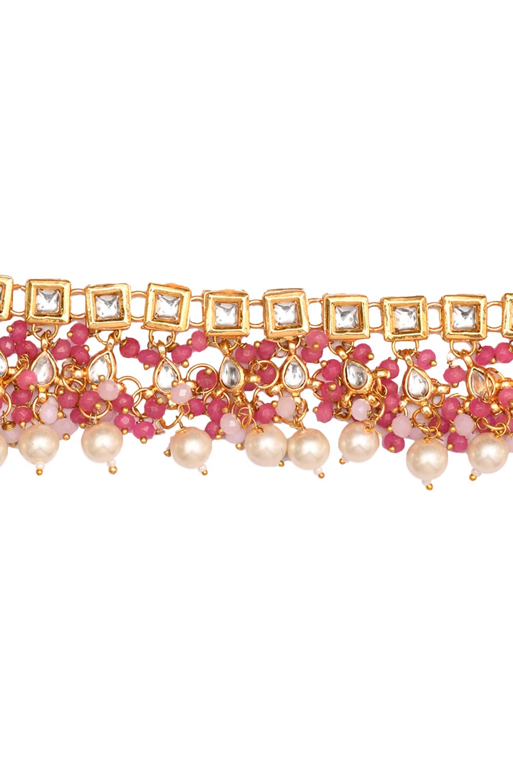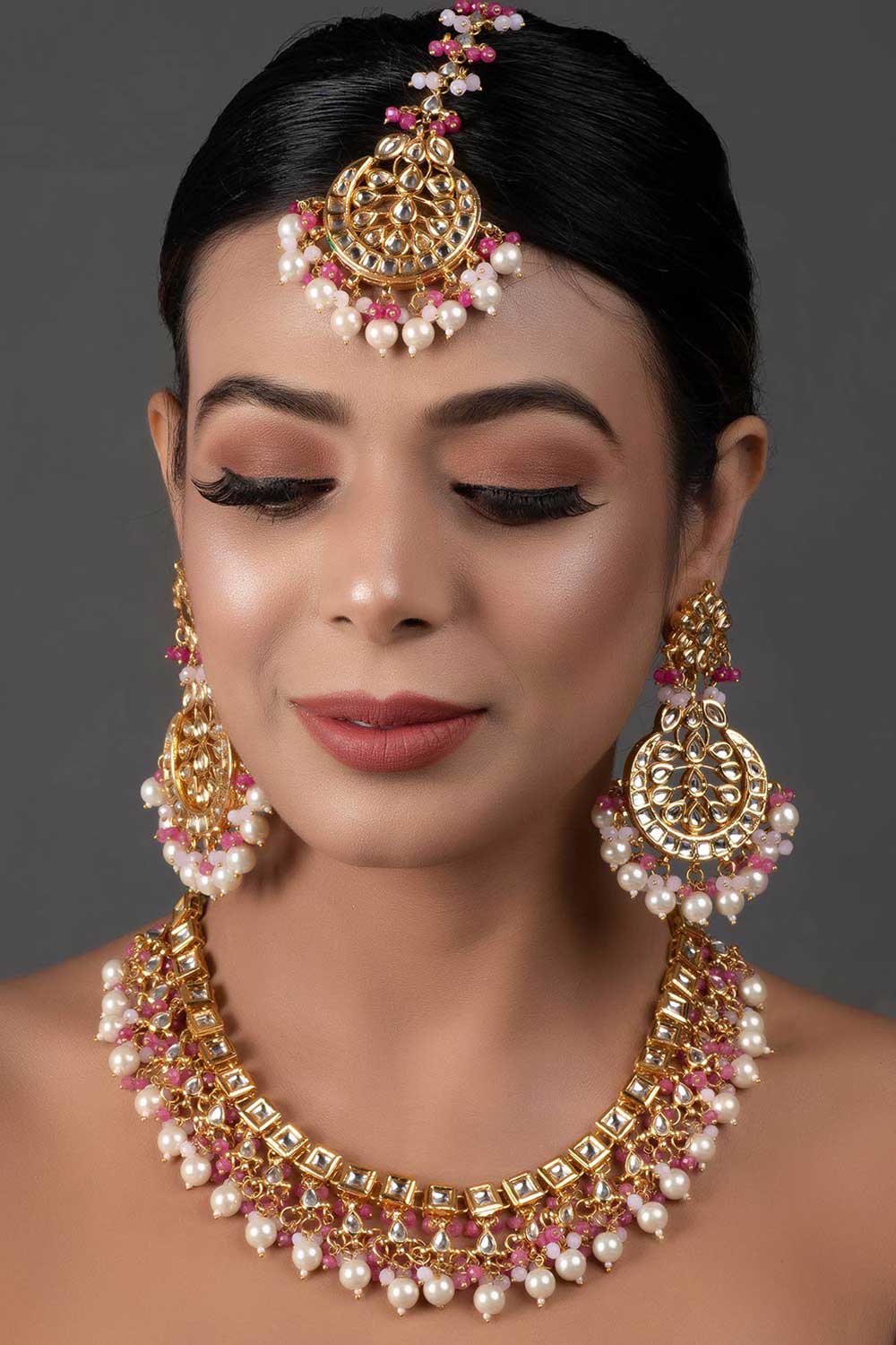 Product Features:- Color: Pearl & Pink beaded Gold Tone Kundan Inspired Necklace with Earrings and Maang Tikka