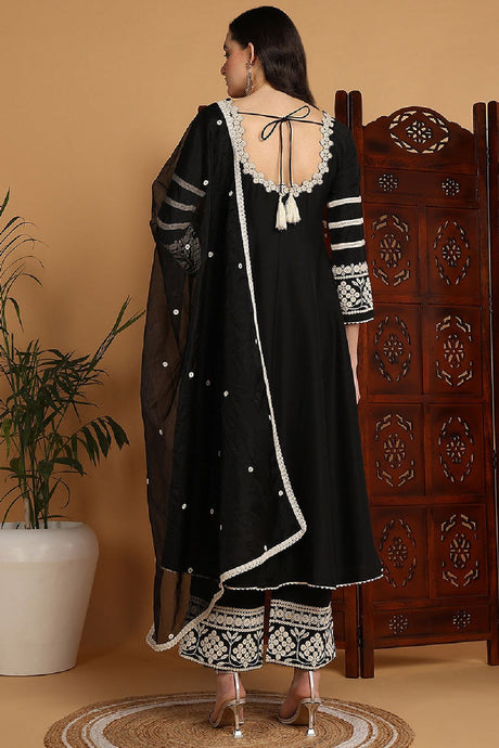 Black Silk Blend Solid Embroidered Anarkali Suit Set