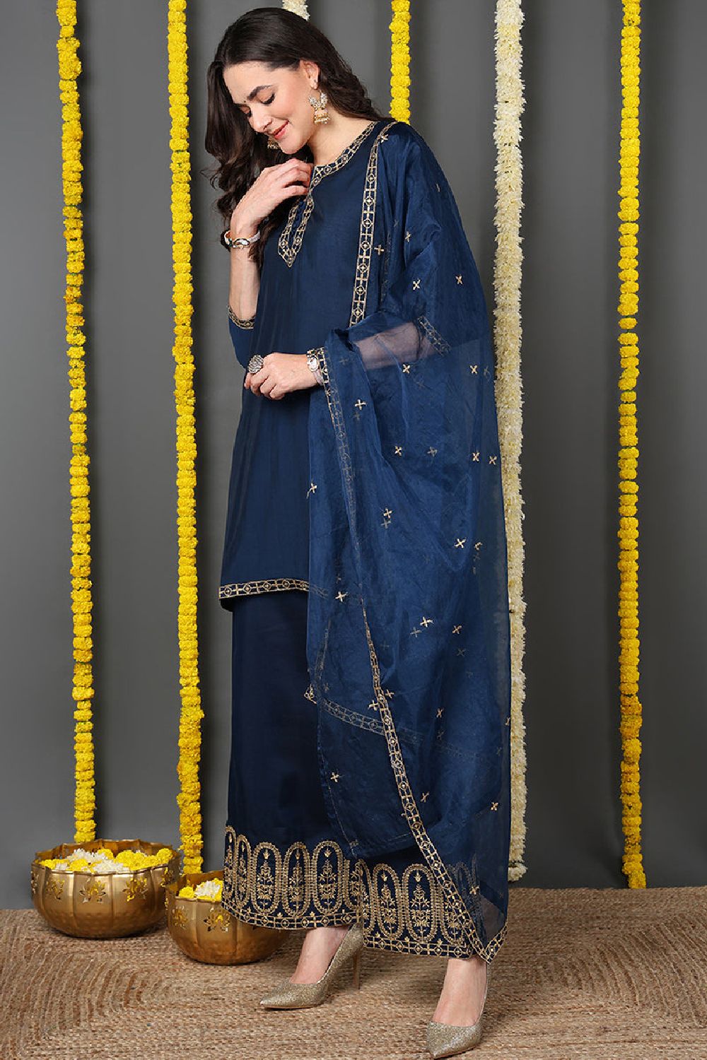 Blue Silk Blend Solid Embroidered Straight Cut Suit Set