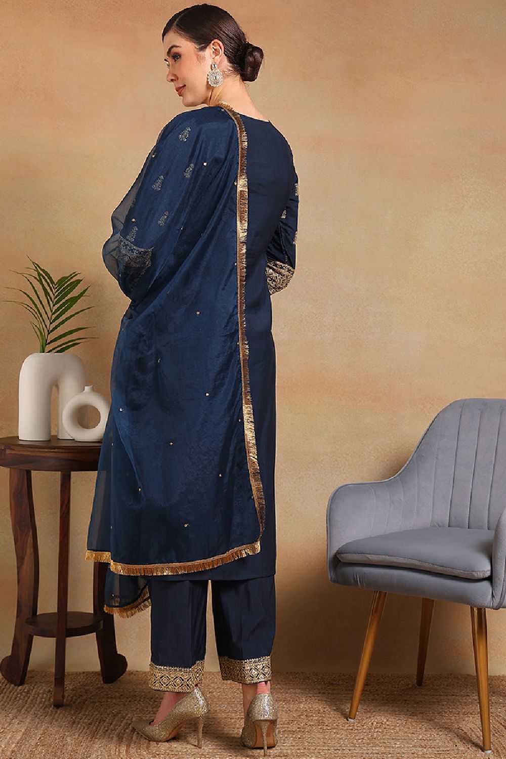 Teal Silk Blend Solid Embroidered Straight Cut Regular Suit Set
