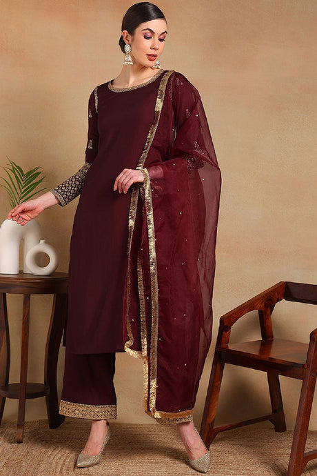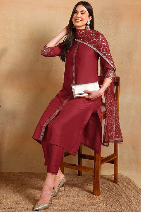 Burgundy Silk Blend Solid Embroidered Straight Cut Regular Suit Set