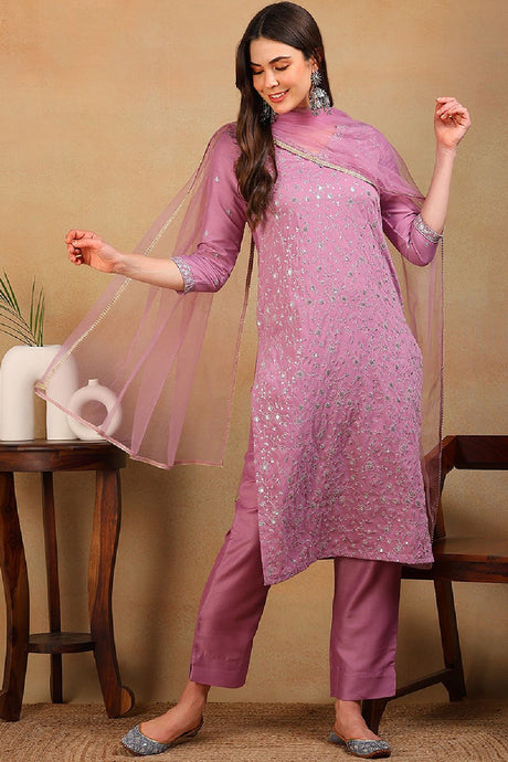 Lavender Silk Blend Solid Embroidered Straight Cut Suit Set