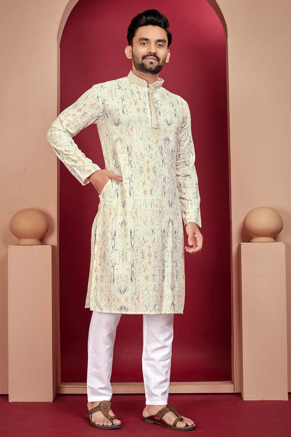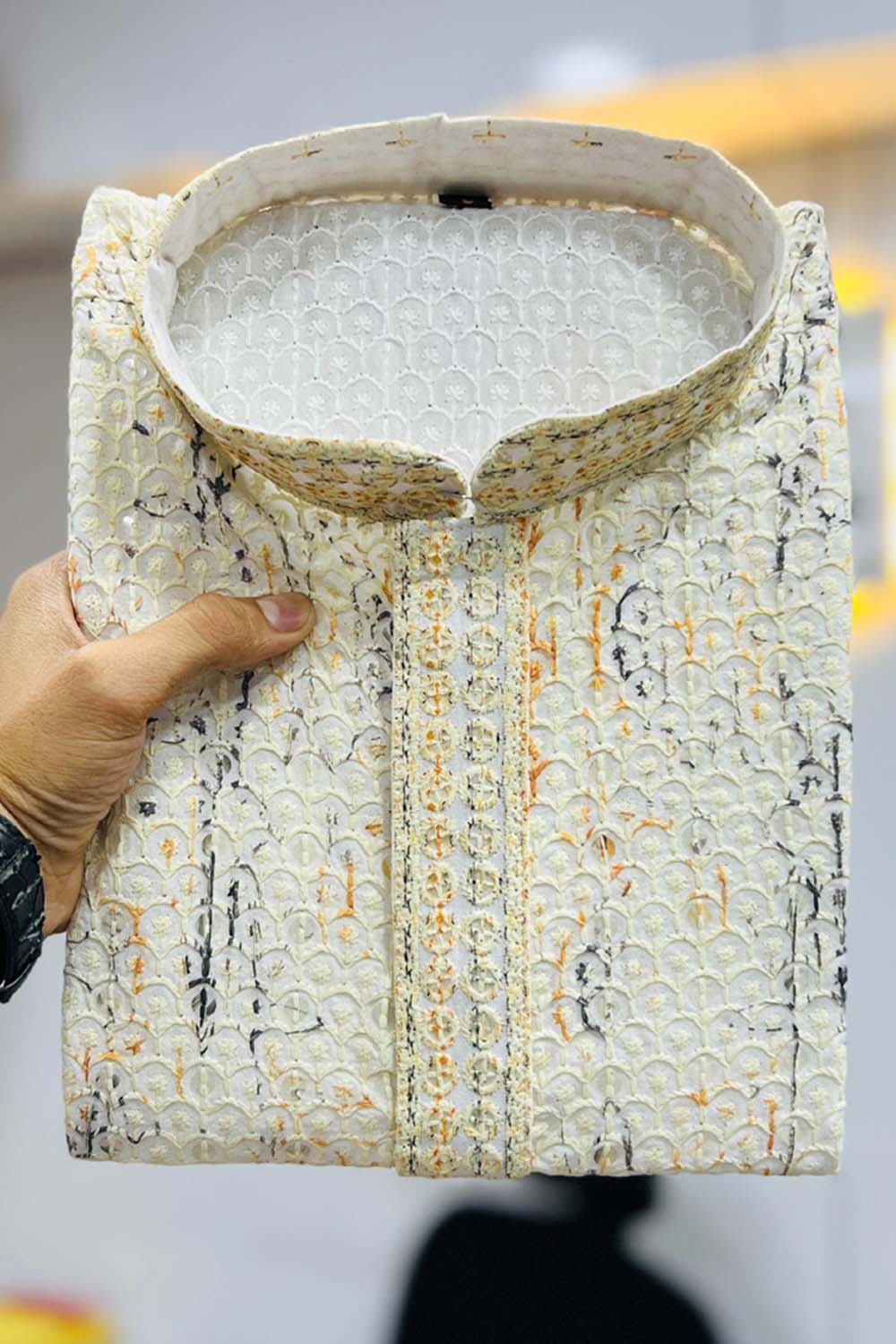 Cream Geometric Chickankari Rayon Men's Kurta Set
