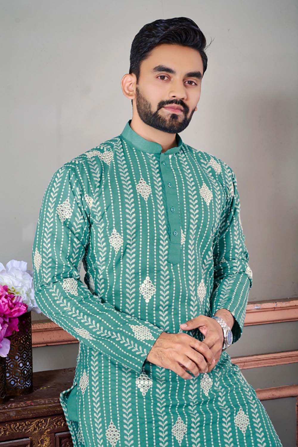 Experience timeless style with our Men's Kurta Set a perfect balance of tradition and modern sophistication. Made from Linen this Kurta set offers unmatched comfort and a refined look. Featuring embroidered and Geometric pattern it reflects a rich heritage with a modern touch. Designed for Festivewear, Mehendi this outfit is perfect for special occasion or your celebrations. Complete the look with mojari shoes and a classic watch for a dapper appearance. Make every occasion special with the elegance of Men's Kurta Set
