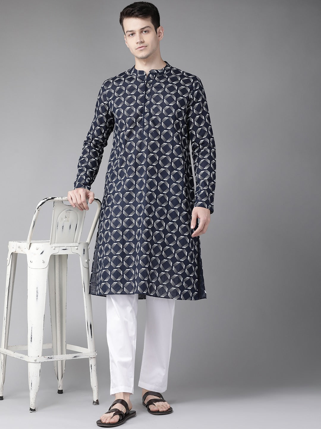 Men's Navy Blue Cotton Geometric Printed Straight Kurta Top