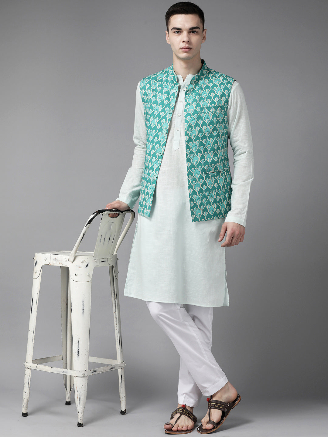 Men Green & Beige Printed Pure Cotton Kurta Pajama With Neharu jacket