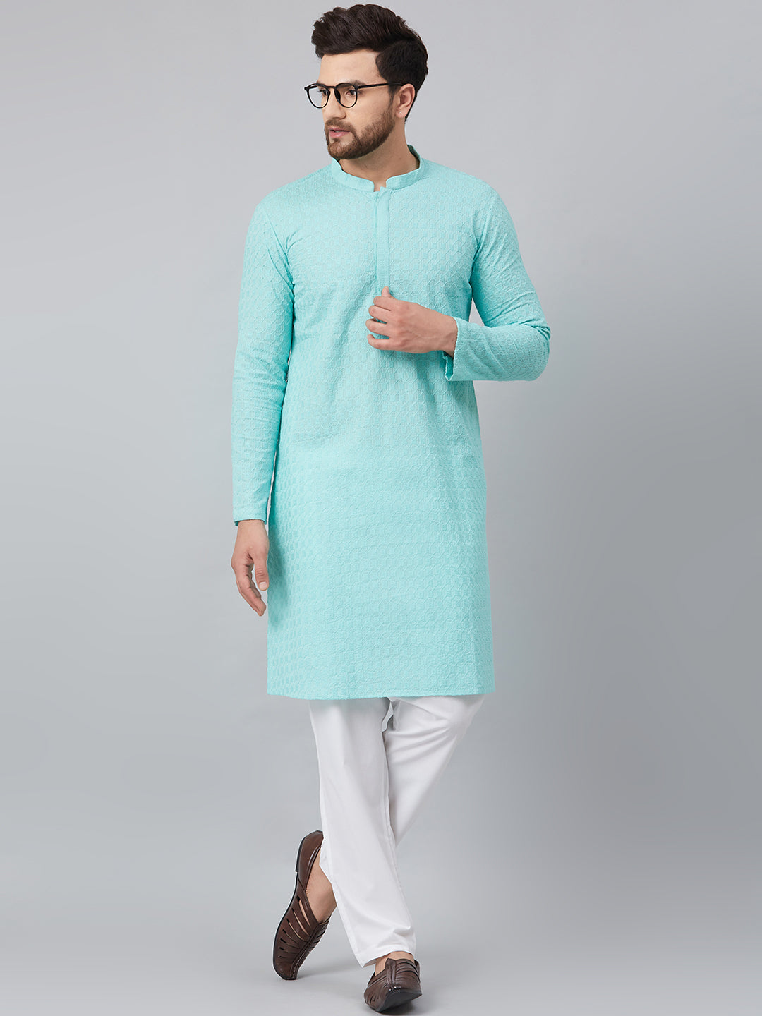 Men's Turquoise Blue Cotton Chikankari Embroidered Kurta Pajama Set