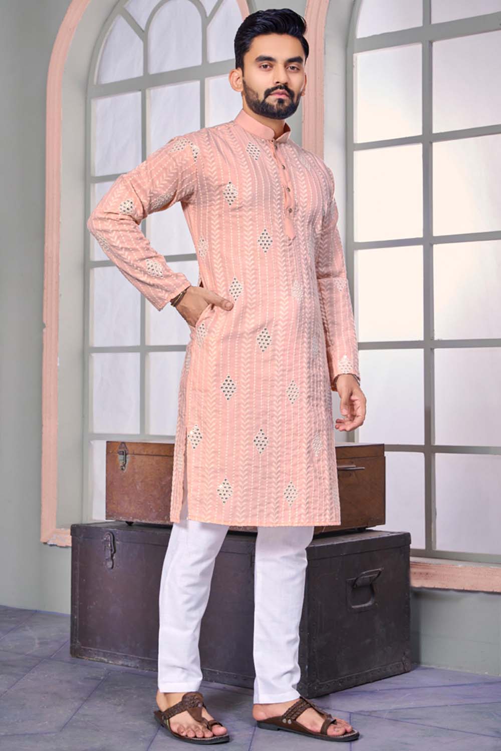 Experience timeless style with our Men's Kurta Set a perfect balance of tradition and modern sophistication. Made from Linen this Kurta set offers unmatched comfort and a refined look. Featuring embroidered and Geometric pattern it reflects a rich heritage with a modern touch. Designed for Festivewear this outfit is perfect for special occasion or your celebrations. Complete the look with mojari shoes and a classic watch for a dapper appearance. Make every occasion special with the elegance of Men's Kurta Set