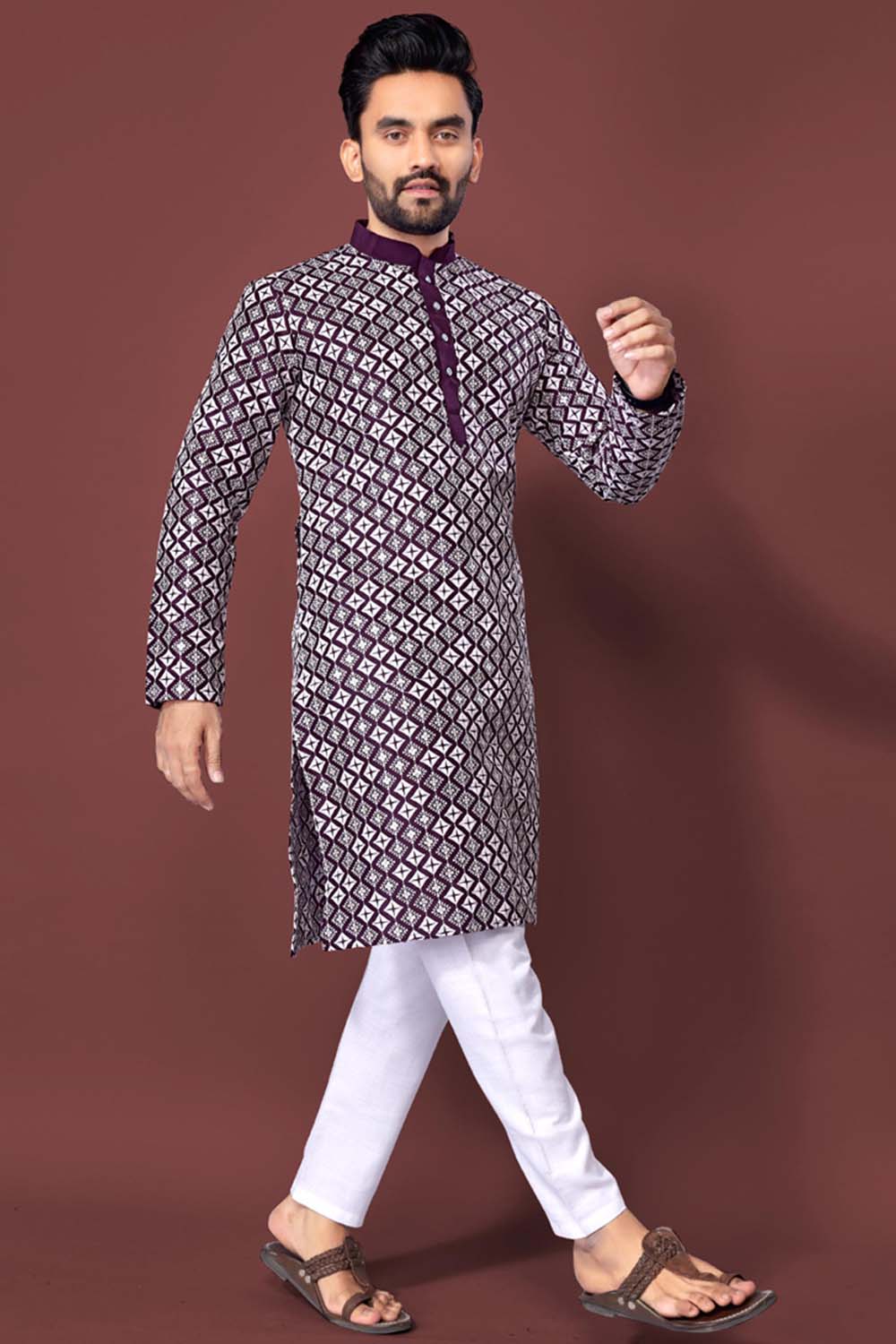 Experience timeless style with our Men's Kurta Set a perfect balance of tradition and modern sophistication. Made from Silk this Kurta set offers unmatched comfort and a refined look. Featuring embroidered and Geometric pattern it reflects a rich heritage with a modern touch. Designed for Festivewear this outfit is perfect for special occasion or your celebrations. Complete the look with mojari shoes and a classic watch for a dapper appearance. Make every occasion special with the elegance of Men's Kurta Set