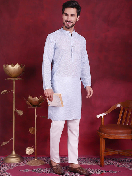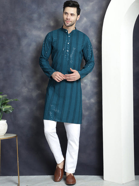 Men's Blue Sequins Chikankari Embroidered Kurta