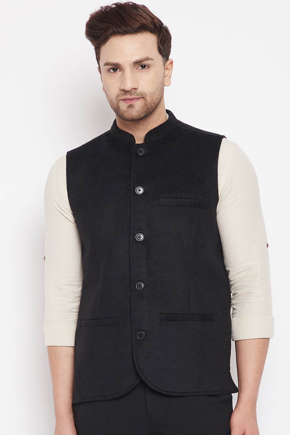Men's Wool Solid Nehru Jacket In Black (NJR-WL700-BKW)