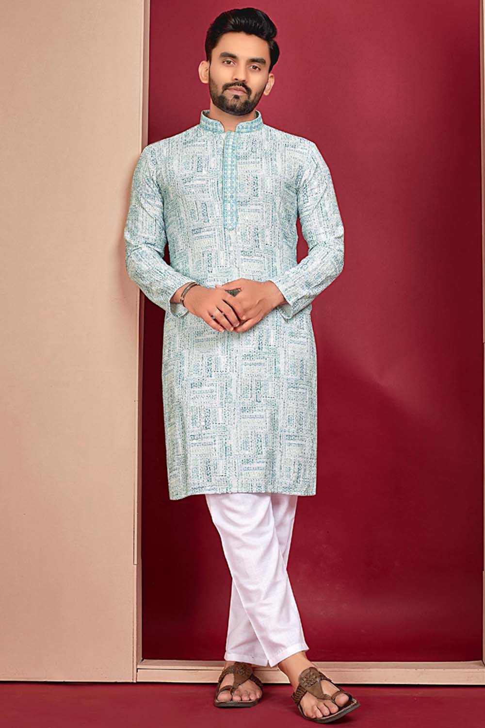 Experience timeless style with our Men's Kurta Set a perfect balance of tradition and modern sophistication. Made from Rayon this Kurta set offers unmatched comfort and a refined look. Featuring lacknowi and Geometric pattern it reflects a rich heritage with a modern touch. Designed for Festivewear this outfit is perfect for special occasion or your celebrations. Complete the look with mojari shoes and a classic watch for a dapper appearance. Make every occasion special with the elegance of Men's Kurta Set