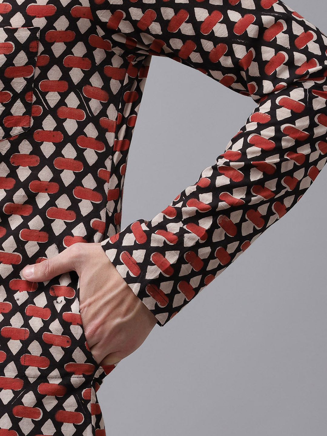 Men Maroon And Black Hand Block Print Sustainable Straight With Kurta Pyjama