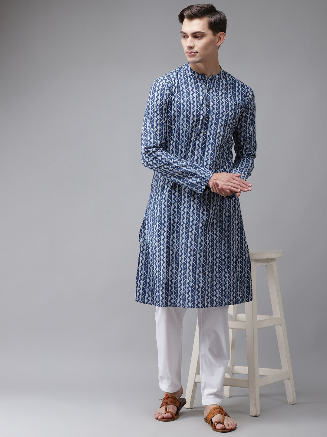Men Blue Pure Cotton Printed Regular Kurta with Trousers