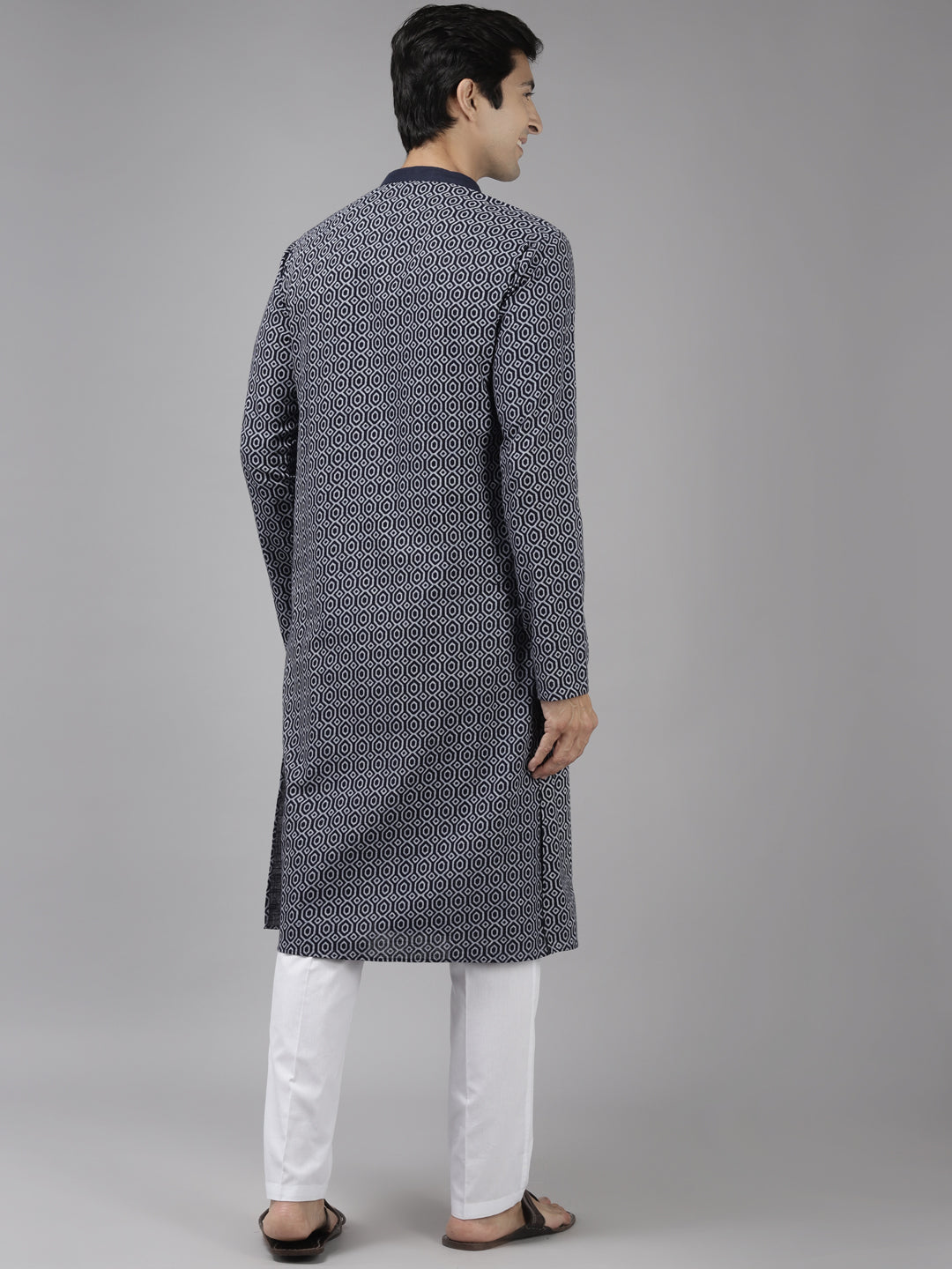 Men Blue Printed Thread Work Indigo Kurta With Pyjama