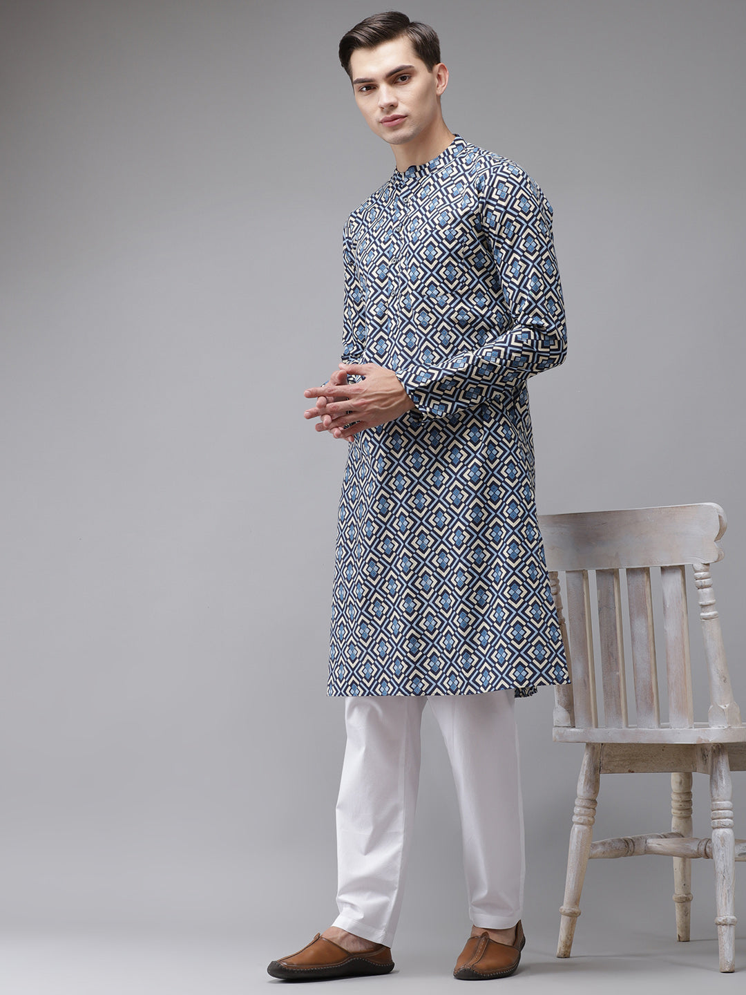 Men Blue And Beige Printed Straight With Kurta Pyjama