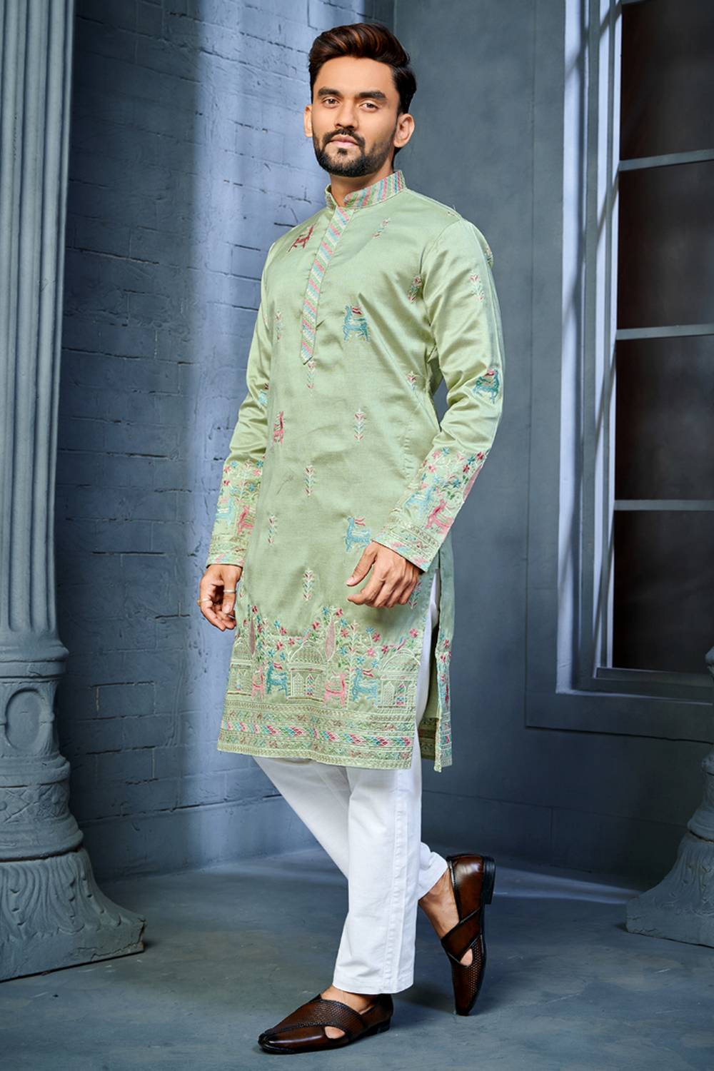 Mens Green Embroidered Silk Kurta Pajama Set