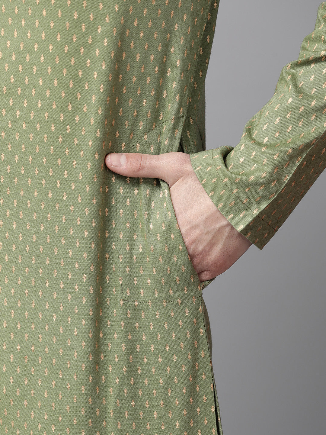 Men Green & Gold Stripe Printed Straight Kurta With Pyjama