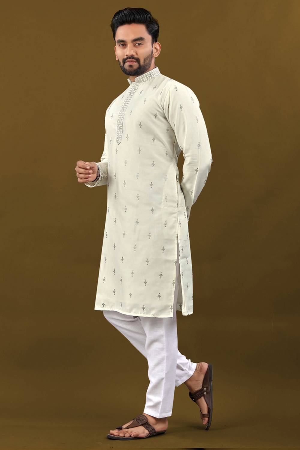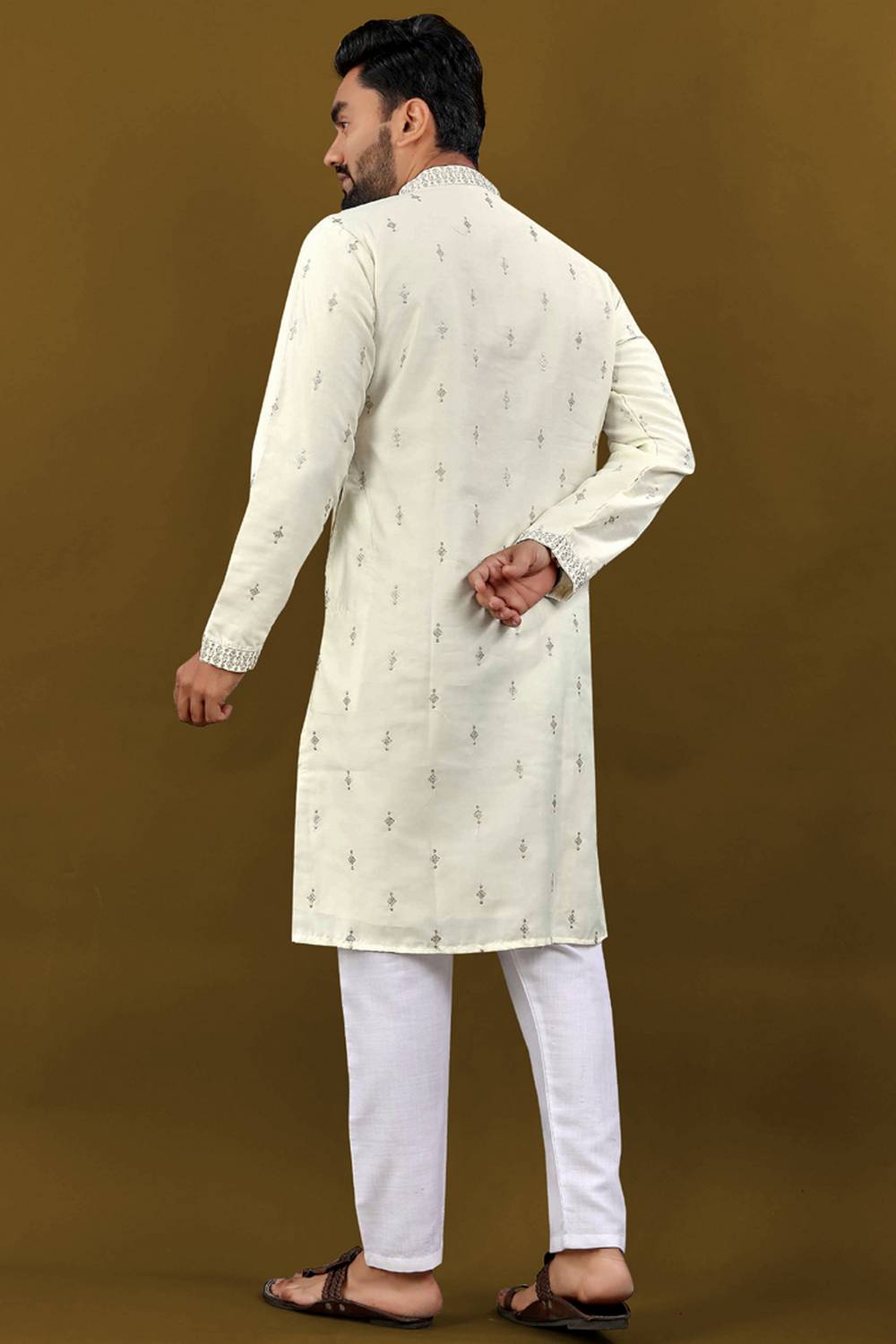 Mens Off White Embroidered Silk Kurta Pajama Set