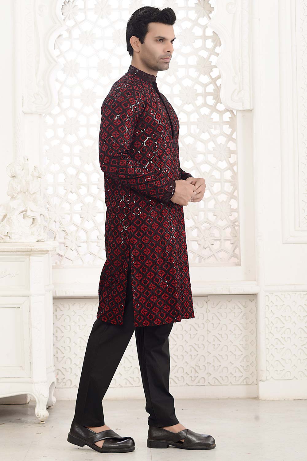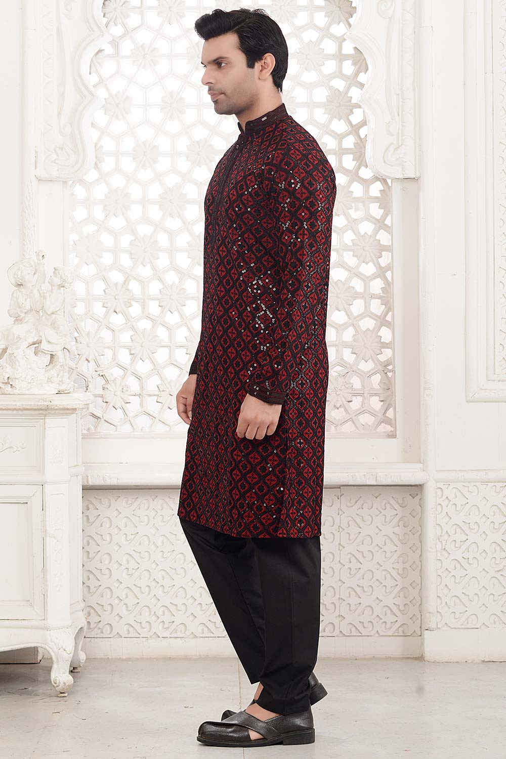 Experience classic elegance with this Red Cotton Kurta Pajama Set, embellished with stunning sequin work that exudes a timeless charm.