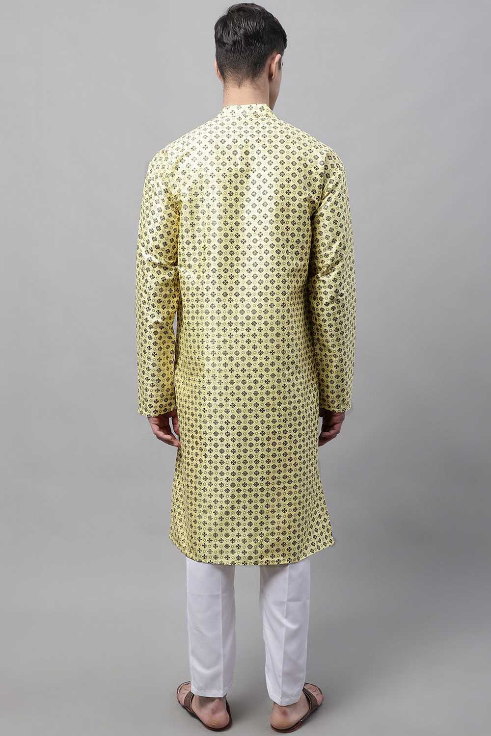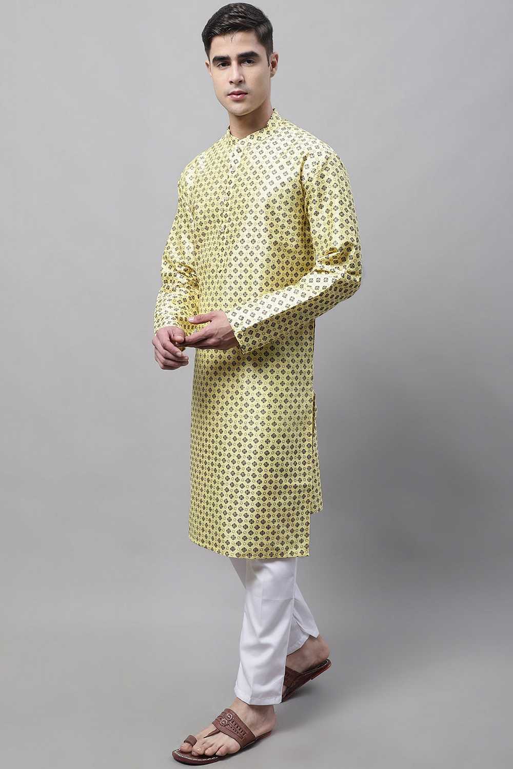 Yellow Geomatric Printed Silk Men's Kurta Sets