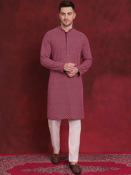 Men's Pink Cotton Thread Embroidered Kurta Pajama Set