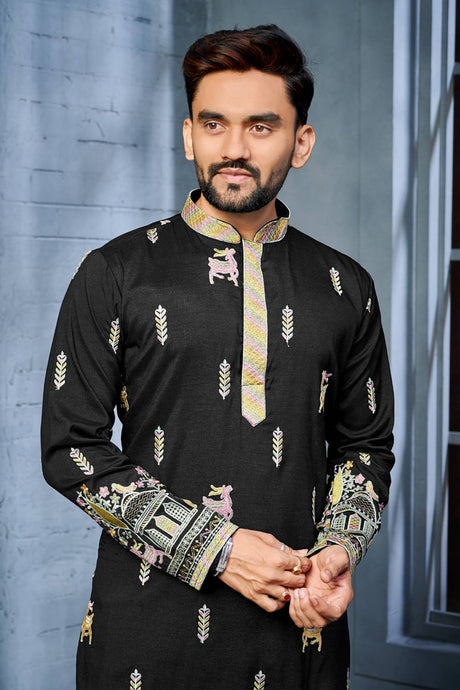 Mens Black Embroidered Silk Kurta Pajama Set