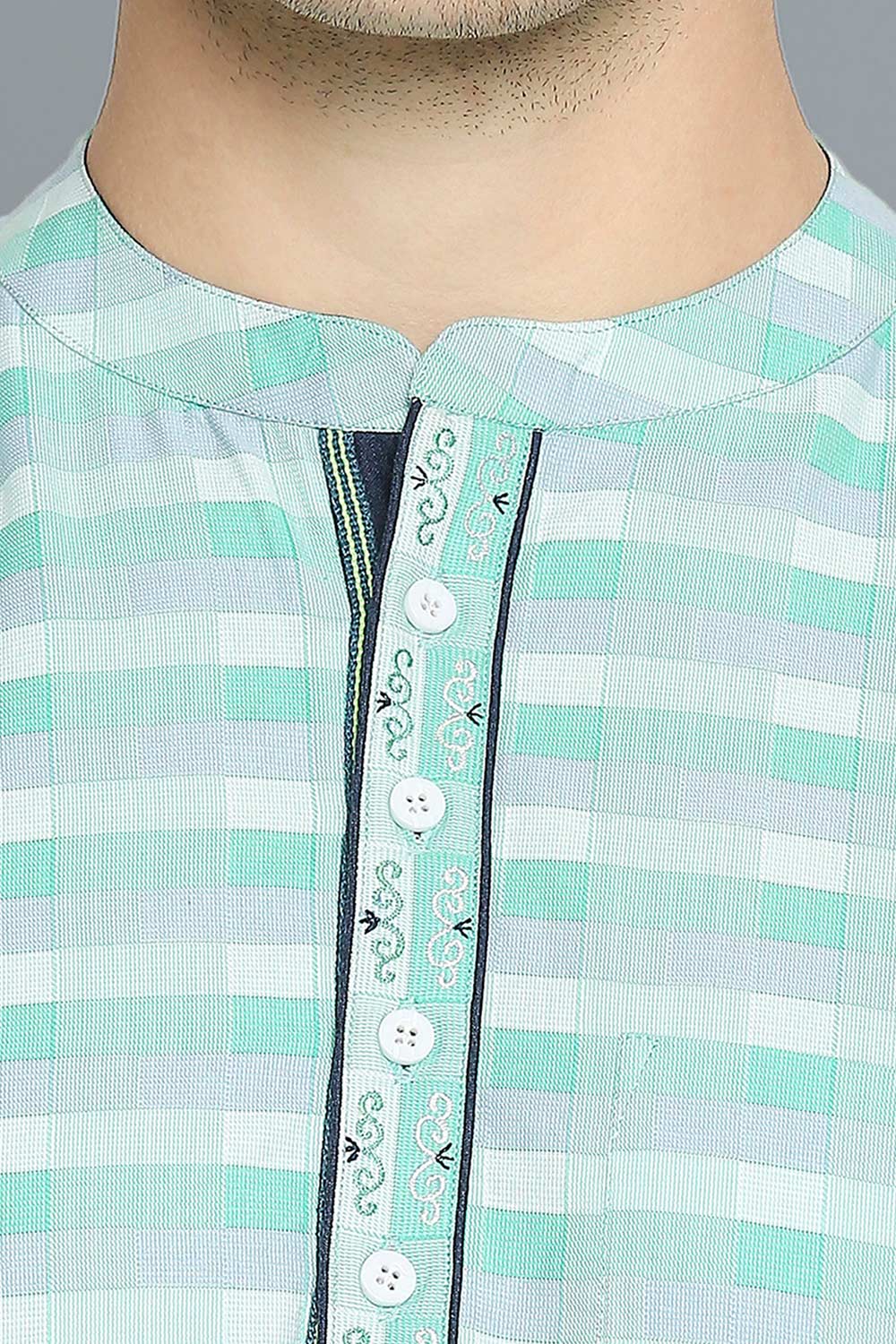 Men's Green And White Cotton Embroidered Full Sleeves Short Kurta