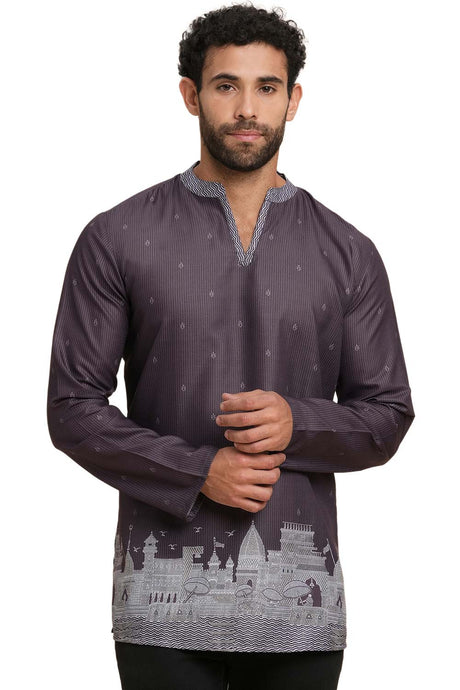 Men's Dark Brown Poly Cotton Printed Short Kurta