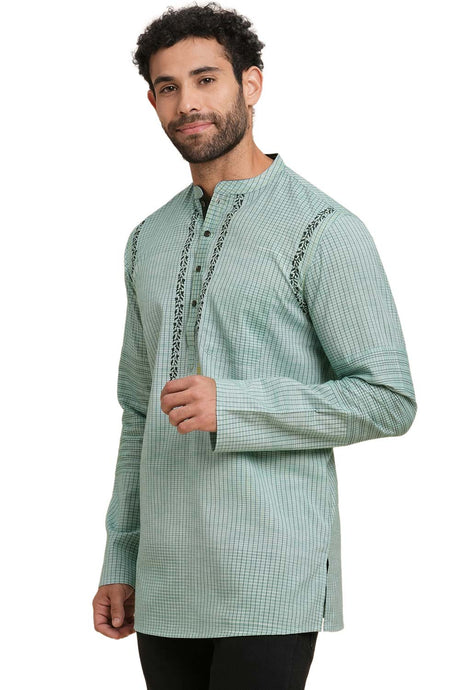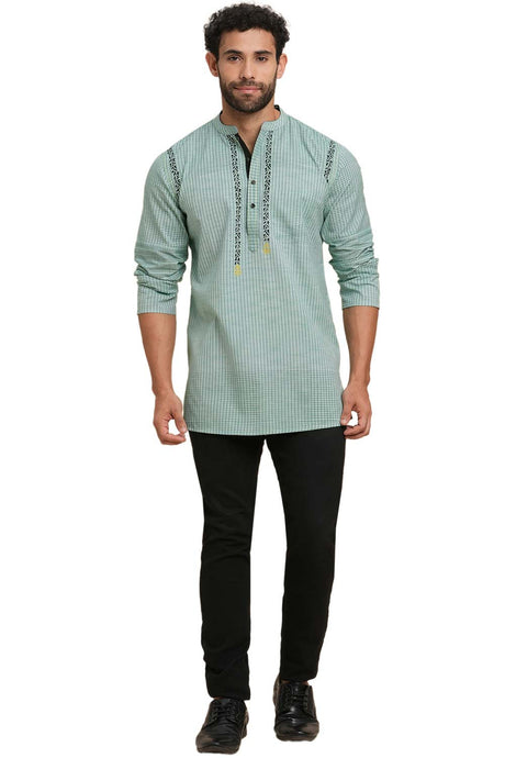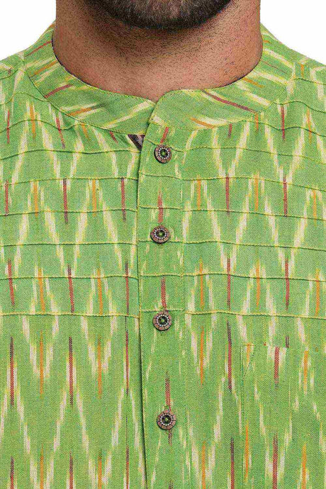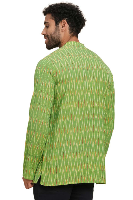 Men's Light Green Cotton Ikkat Weave Short Kurta