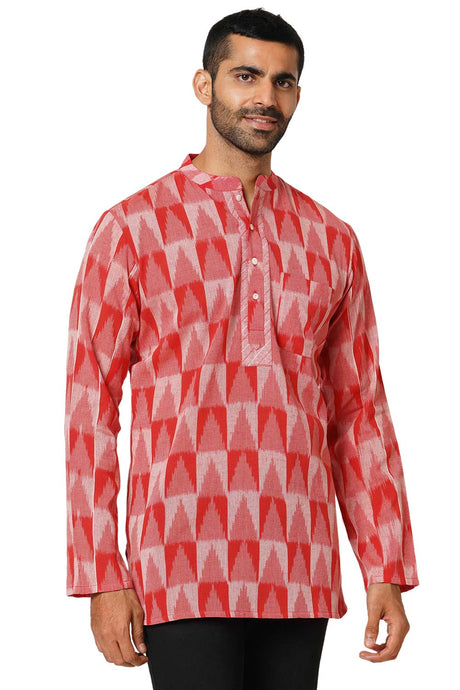 Men's Red Cotton Ikkat Weave Short Kurta