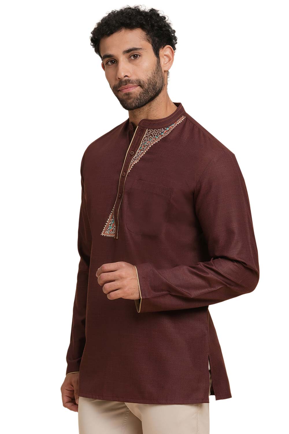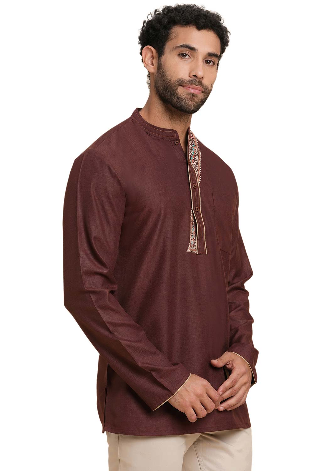 Men's Brown Poly Cotton Plain Solid Short Kurta