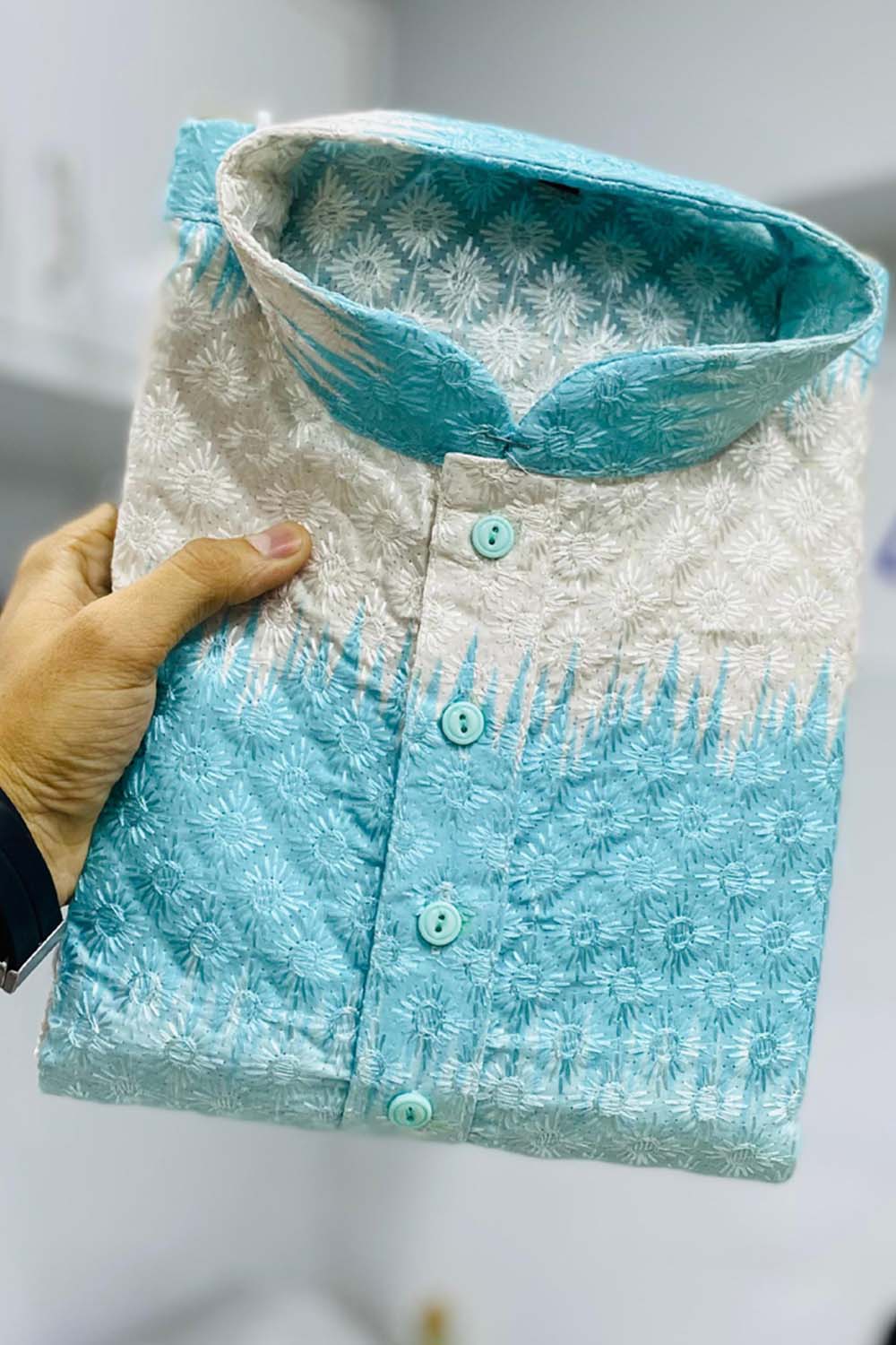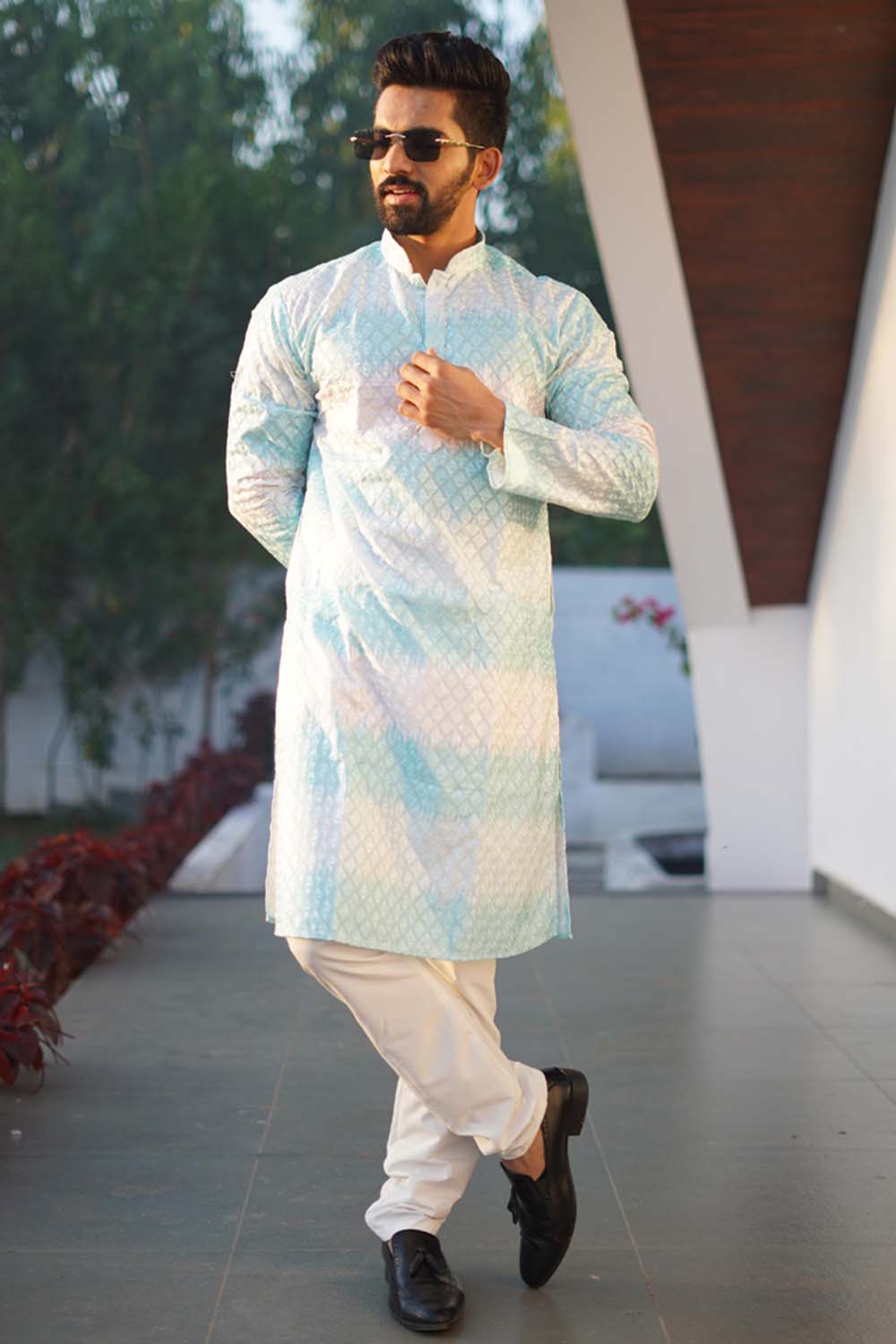 Experience timeless style with our Men's Kurta Set a perfect balance of tradition and modern sophistication. Made from Cotton this Kurta set offers unmatched comfort and a refined look. Featuring embroidered and Geometric pattern it reflects a rich heritage with a modern touch. Designed for Festivewear this outfit is perfect for special occasion or your celebrations. Complete the look with mojari shoes and a classic watch for a dapper appearance. Make every occasion special with the elegance of Men's Kurta Set