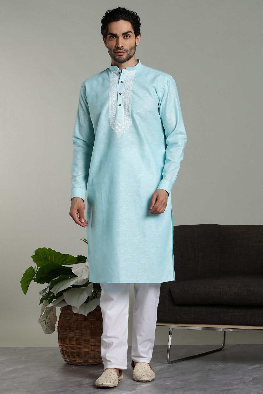 Dress him in elegance with our Men's Kurta Sets a classic Kurta Set designed for timeless style. Crafted from soft Cotton Linen it offers a comfortable fit for all-day wear. The intricate Solid with neck Embriodery, adds a traditional touch to this outfit. Perfect for Festive this Kurta Set is a versatile choice for any festive or formal occasion. Pair it with white churidar pants and traditional juttis for a complete ethnic outfit. Make every moment special with the charm of Kurta Set