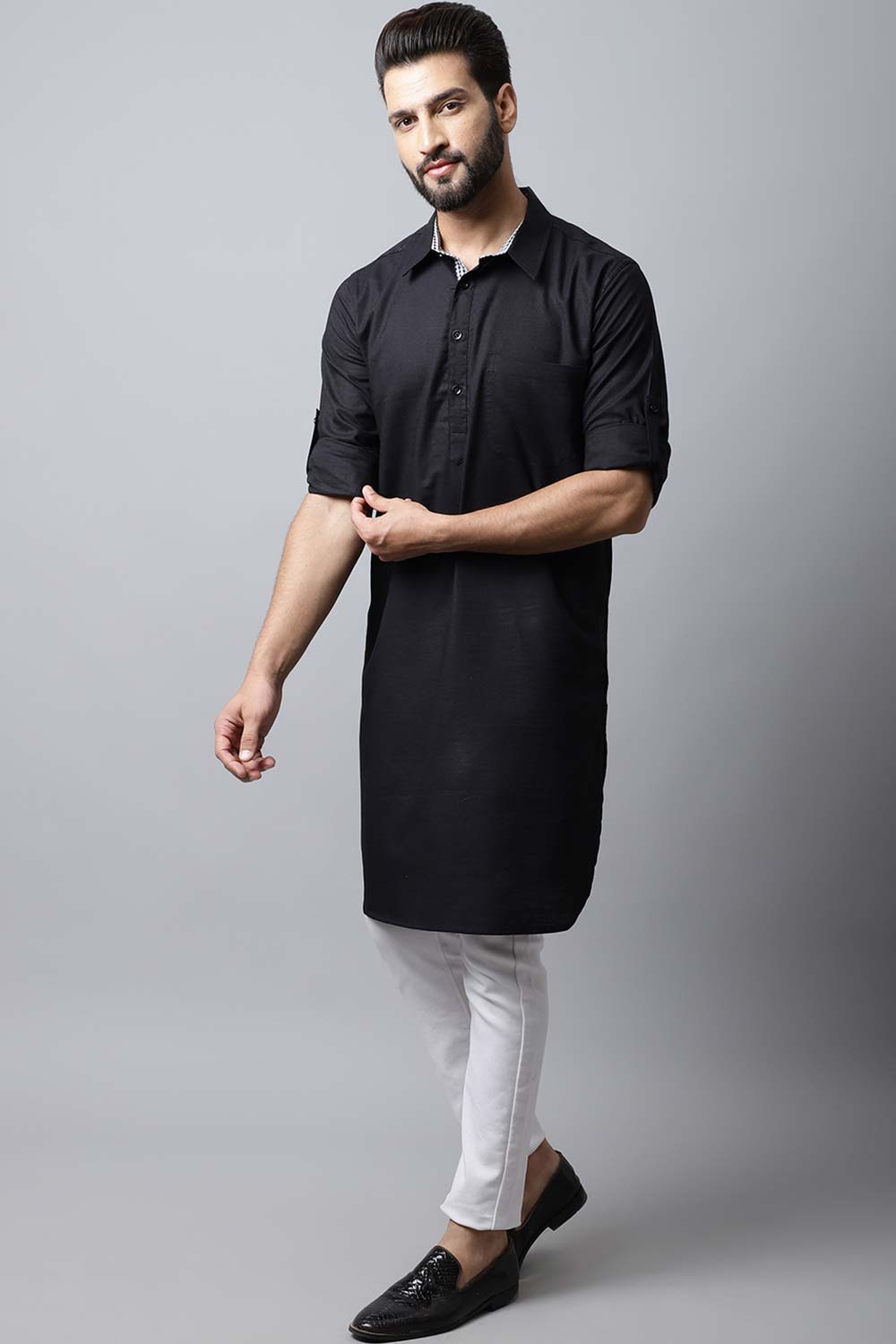 Men's Dark Black Self-Design Full Sleeve Long Kurta Top