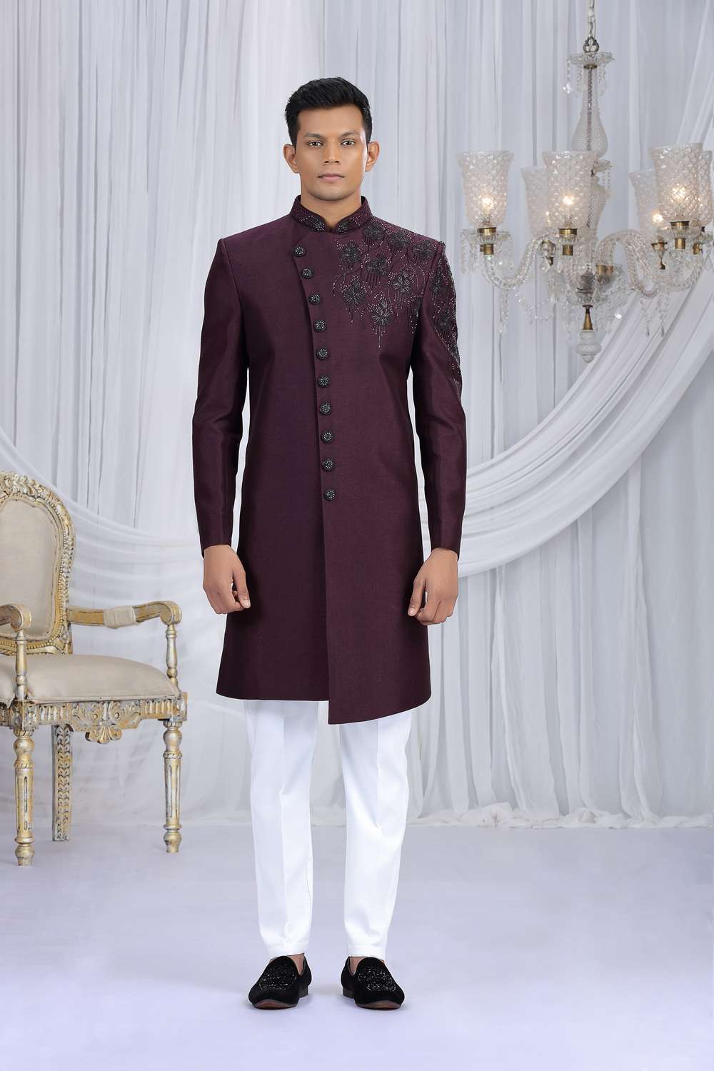 Men's Wine Embroidered Art Silk Sherwani Sets