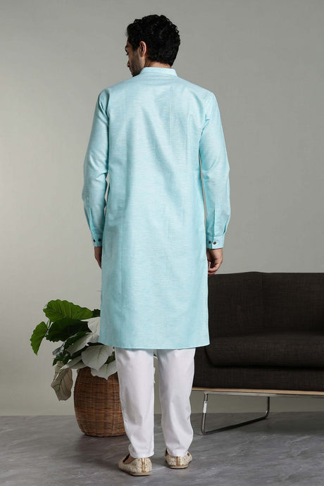Boy's Peacock Green Self Printed Art Silk Kurta Pyjama Set