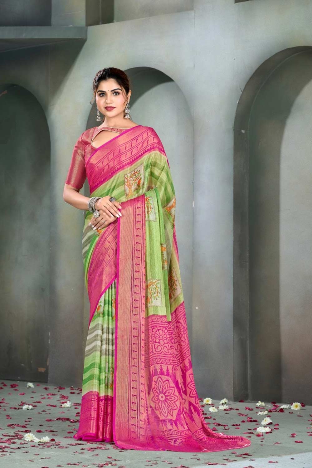 Elegant Multi-Color Brasso printed Saree saree adorned with delicate prints, perfect for any occasion. The lightweight fabric drapes beautifully, offering both comfort and style. Ideal for a sophisticated look with a touch of grace.