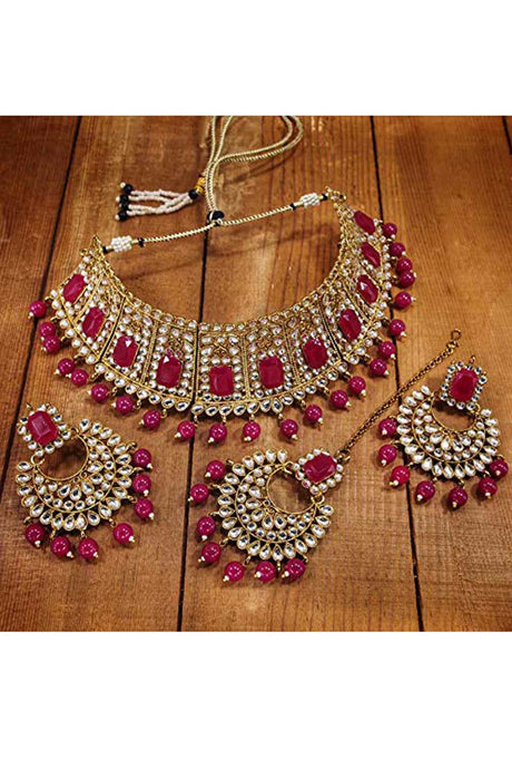 Red And Blue Gold-Plated Kundan And Pearls Bead Necklaces