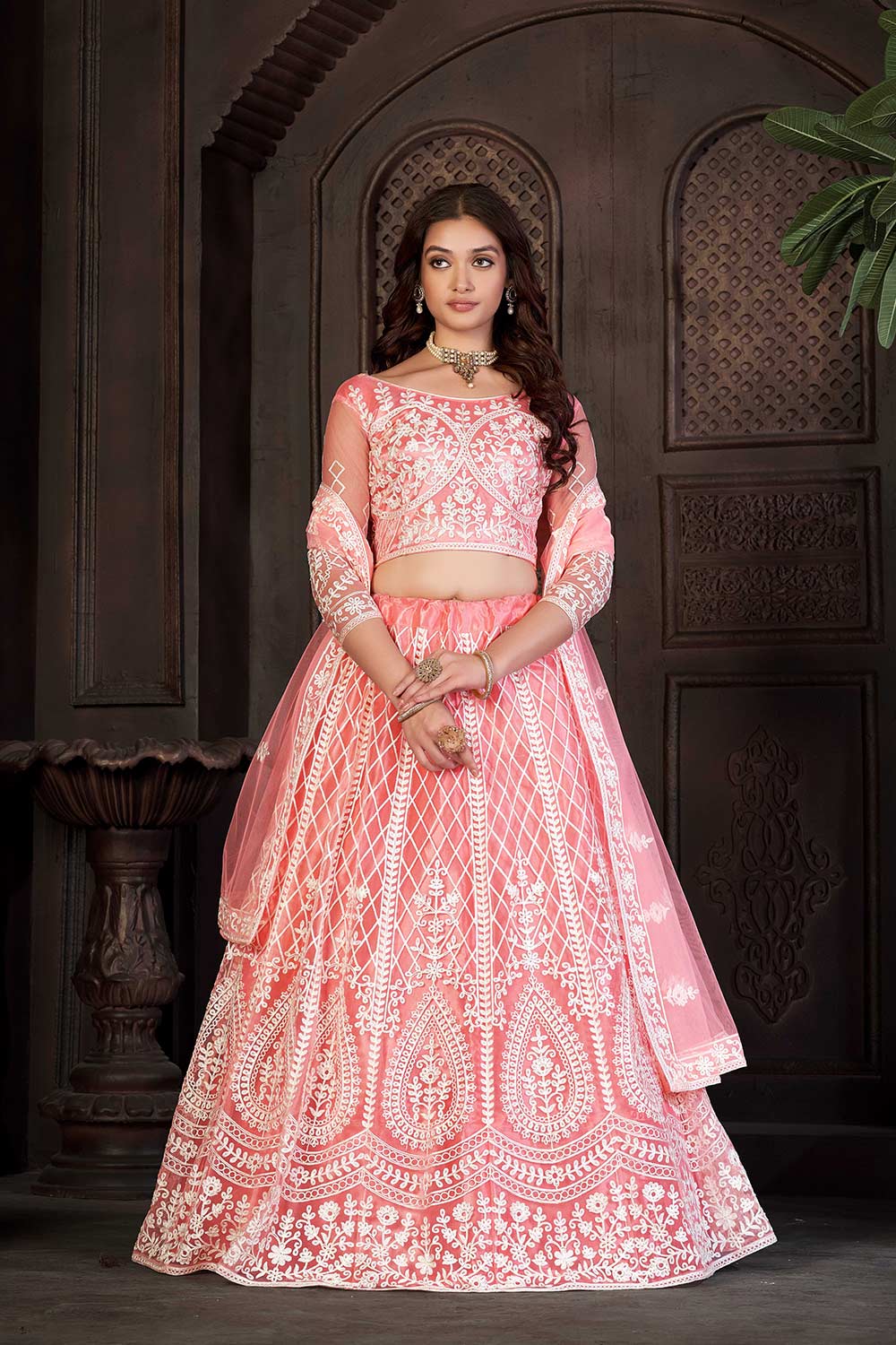 This Peach Net Embroidery Round Neck Lehenga , adorned with detailed round neck embroidery, offers a graceful and refined look for all your celebrations.