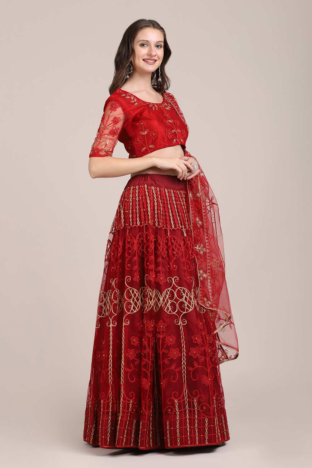Red Net Embroidered Lehenga Choli