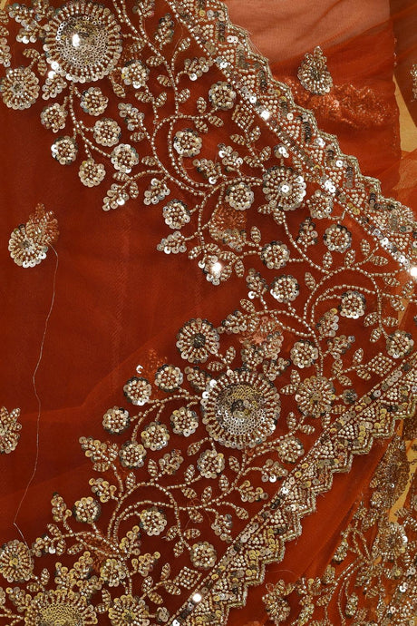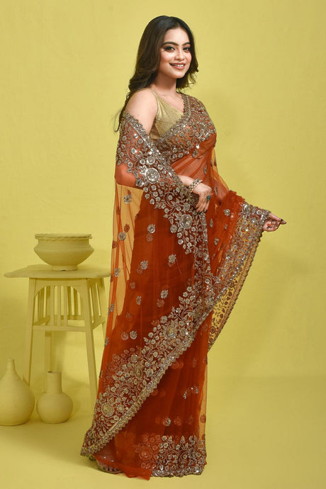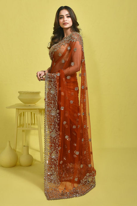 Orange Beads & Stone Embossed Net Saree (RDNOOZ6C3760)