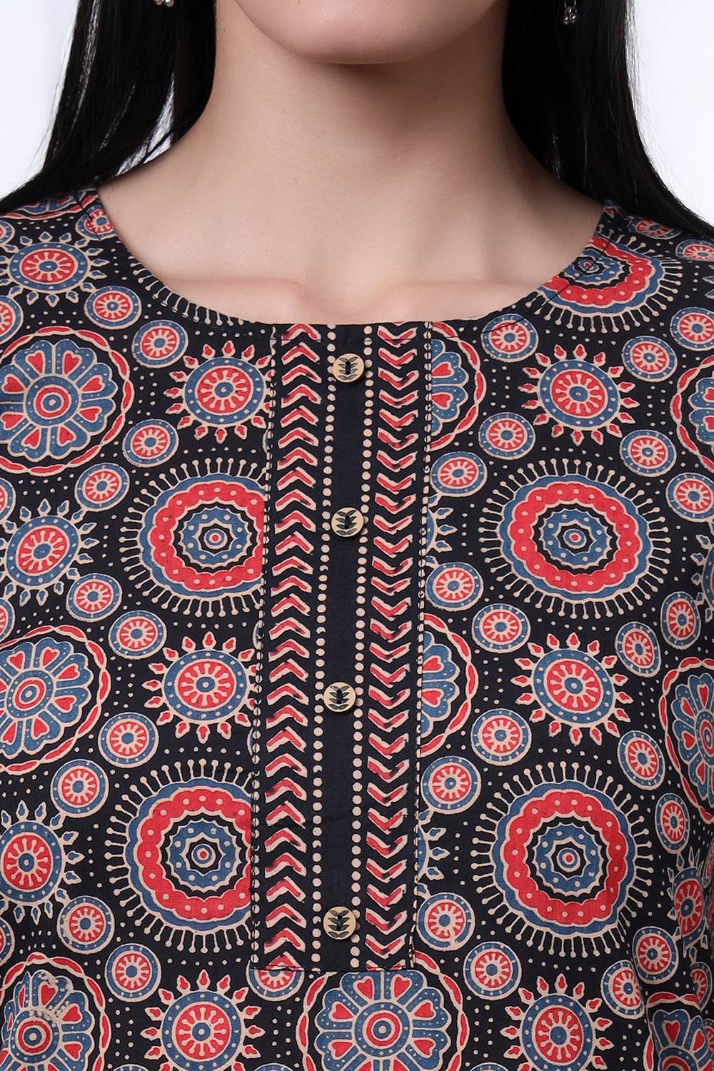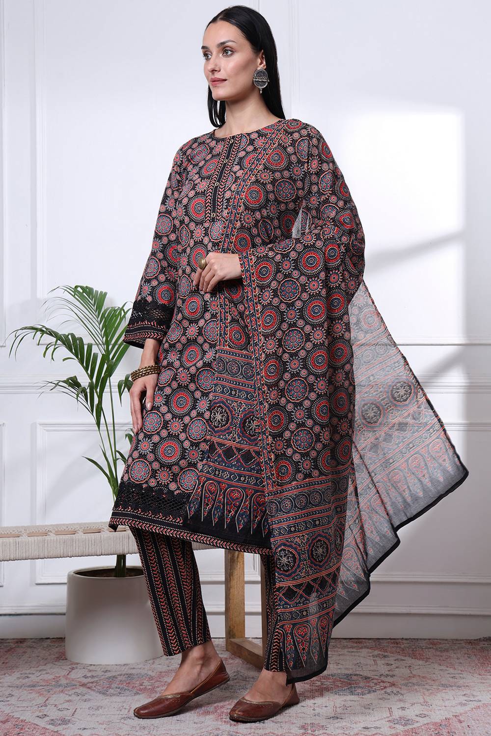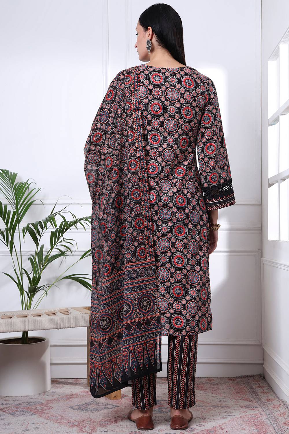 Black Ethnic Motifs Printed Cotton Straight Cut Suit Set